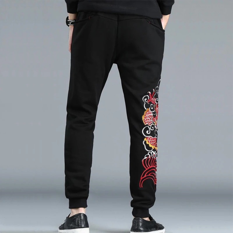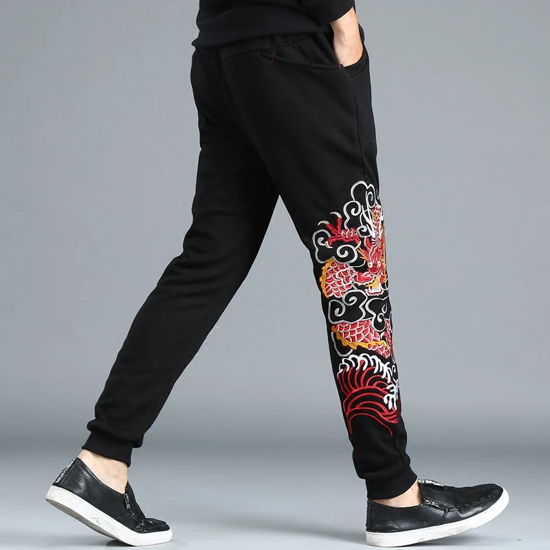 Chinese style social dragon embroidered pants men's autumn slim pants day series close leg Leggings